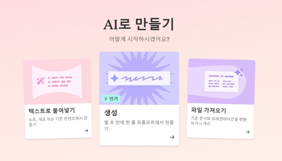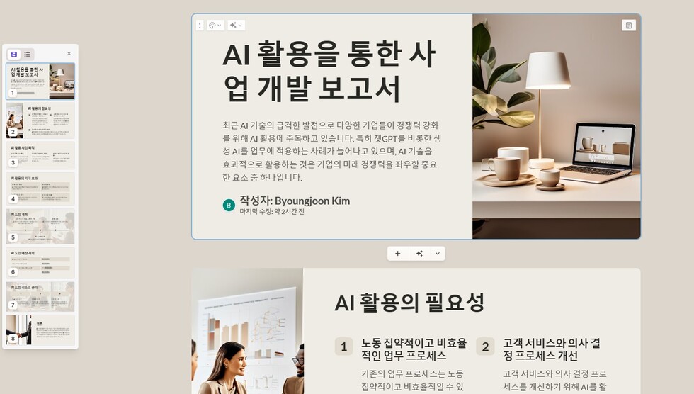 PPT 작업에서 효율성을 원하는가? 그렇다면 Gamma라는 툴을 추천한다. 특히, 텍스트 형태의 보고서를 기입하면 AI의 판단에 따라 자동으로 PPT의 양식을 구성해준다. 물론 최종 보고용 정도의 퀄리티를 기대하기는 어렵지만, PPT 작업이 어려운 이들에게 가이드를 제공해주기에는 충분히 효과적인 도구다.