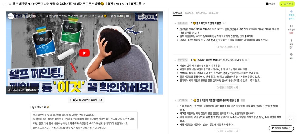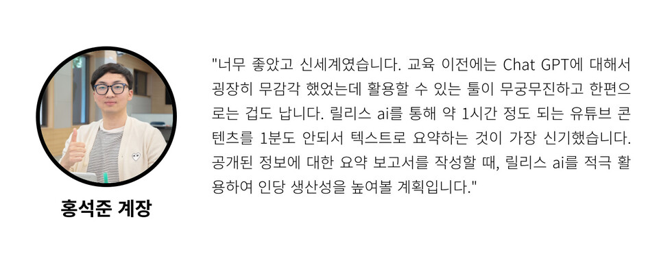 세번째는 업무는 물론 일상에서도 유용한 툴이다. ‘릴리스AI’는 영상, 웹사이트, PDF, 녹음, 텍스트 등을 요약해주는 툴이다. 영상이 된다는 점이 가장 인상깊은데, 유튜브 링크를 넣으면 해당 영상을 분석하여 요약을 해준다. 너무 많은 정보가 담긴 유튜브 영상을 텍스트로 핵심만 파악하기 용이할뿐더러, OTT 영상 리뷰의 요약으로 ‘본 척’을 할 수도 있다.