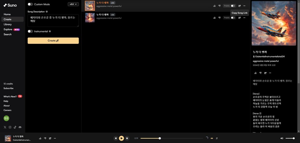 마지막은 재미를 위해 추가해봤다. AI가 작곡과 작사까지 해준다면 믿겠는가? AI가 워낙 여러 가지 성과를 이룩하다 보니, 사실 못 믿을 것이 없긴 하다. Suno는 컨셉만 주면 알아서 작곡과 작사를 해주는 신기한 도구다. 인간의 하찮은(?) 인풋에 대비하여 워낙 말도 안 되는 아웃풋이 나오다 보니 유튜브 방송에서도 종종 해당 툴을 통해 시청자들에게 웃음을 주는 형태로 사용되고 있다. 필자도 작곡을 해보았다(노래 제목: 손오공과 배지터 누가 더 쎌까)
