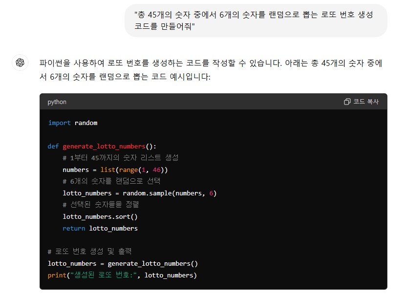 간단히 쉬운 예시로 로또 번호를 무작위로 뽑을 수 있는 코드를 만들어 보겠습니다. 예를 들어, "총 45개의 숫자 중에서 6개의 숫자를 랜덤으로 뽑는 로또 번호 생성 코드를 만들어줘"라고 요청하면 챗GPT가 간단한 코드를 작성해 줍니다. 이를 통해 로또 번호를 쉽게 생성할 수 있습니다.